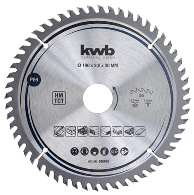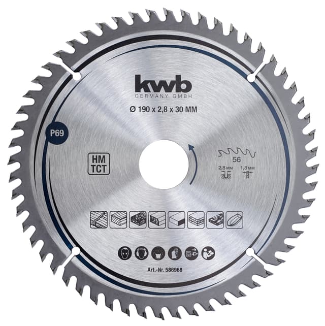 Hårdmetallbestyckad, snabba, rena snitt med urslitningsfria skärkanter. Fina tänder, för handhållna cirkelsågar. För massivt trä, laminerade skivor (arbetsytor och köksbänkskivor), trälamellskivor, spånskivor och träfiberplattor samt glasfiberförstärkt plast.