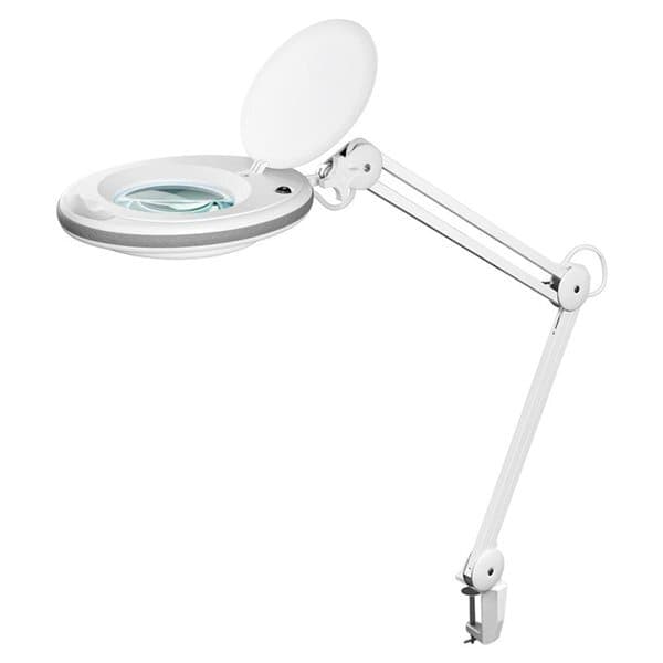 127 mm glasslinse, 1,75x forstørrelse 3 dioptrier 520 lumen 127 mm forstørrelsesdiameter med skyggefri LED-ringbelysning Standard glasslins (inkl. Beskyttelsesdeksel) med 3 dioptrier og forstørrelse 1,75x Dobbel leddarm med en arbeidsradius på 700 mm Forstørrelsesglasshodet kan vippes opp til 90 ° og roteres 360 ° Klemmestøtte for bord opp til 60 mm tykke