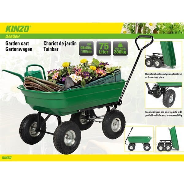 Hagevogn fra Kinzo som hjelper deg å flytte hageavfall eller planter. Vognen har en kapasitet på 75 liter så at du kan transportere en stor last. Transportvognen kan ta en last på hele 200 kg!