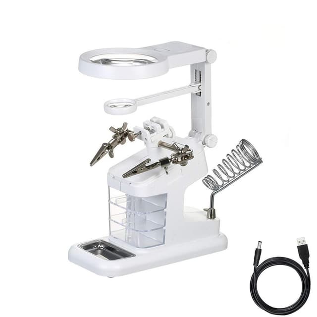 Forstørrelsesglasset har en stabil base, justerbare hjelpende hender med klips og 3 verktøykasser. Med 3 forstørrelseslinser og 10 ultrasterke lysdioder er den et perfekt hjelpemiddel for å kunne se detaljer på nært hold.