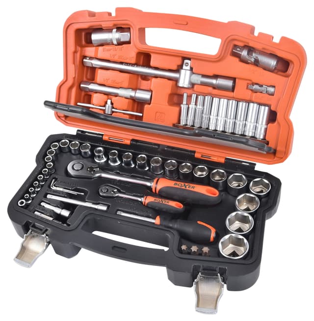 Skrallehåndtak med quick release og soft grep Satin finish og utført i krom Inneholder hylser, lange hylser, forlengere, kardangledd, T-nøkkel, adapter, bitsholdere, tennplugpipe & sekskantnøkler I CrV-stålLes mer om produktet