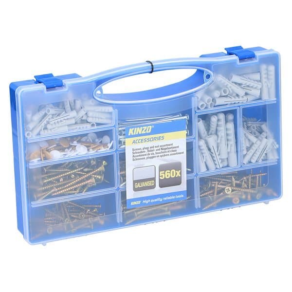 Med dette store plugg- og skruesett i 560 deler har du alt du trenger for å fikse jobben! Settet består av 240 skruer, 90 spiker og 150 plugger i ulike størrelser samt 80 beskyttelsehatter. Alle skruer og spiker er galvaniserte. Settet kommer i et smart plastfutteral med 11 lommer og transparent lokk.