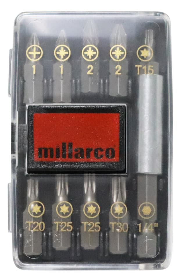 Når du bygger og renoverer, vil forskjellige trinn og oppgaver sannsynligvis kreve forskjellige skruer i forskjellige størrelser. Ved hjelp av et bitssett får du tilgang til mange bitsstørrelser, slik at du kan arbeide uten problemer. Settet i lommeformat inneholder: 1 x stjernespiss: PH1 3 x Pozidrive-spiss: PZ 1-2-2 5 x TORX-spiss: T15-T20-T25-T30 1 x magnetholder Materiale: S2-stål