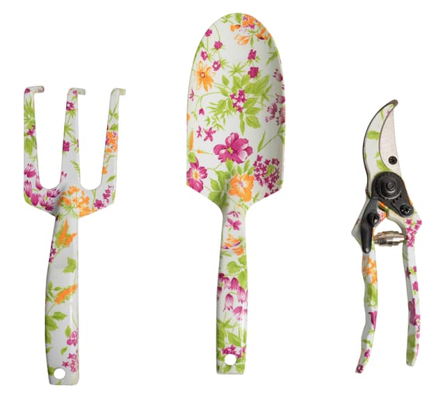 3 st. redskap Består av: 1 x skyffel 1 x kratta 1 x beskärningssax Material: aluminium Blommönster