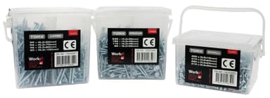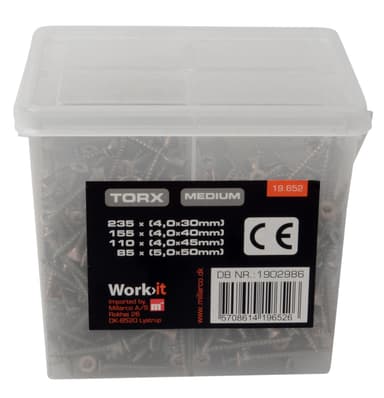 TORX sponplateskruer i praktisk boks, som inneholder: 235 stk. - 4,0 x 30 mm 155 stk. - 4,0 x 40 mm 110 stk. - 4,0 x 45 mm 85 stk. - 5,0 x 50 mm CE-godkjent.Les mer om produktet