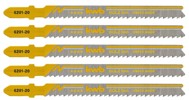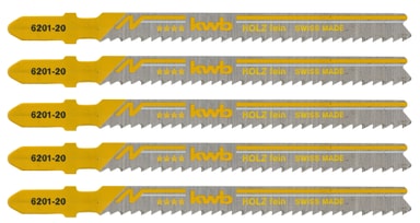Stikksagblad, høyverdig karbonstål, herdet, kryss- og hulslipte tenner, rask og renslig saging, med innstikktenner, for problemfritt dykksnitt, til tre, møbelplater, sponplater, og fiberplater, lett plast.