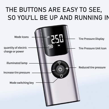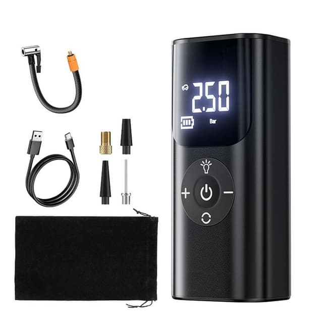 Praktisk trådløs design: Opplev friheten med trådløs drift med denne trådløse bil dekkpumpen. Ingen flere sammenfiltrede ledninger eller leting etter stikkontakter. Denne bærbare luftkompressoren lar deg pumpe opp dekkene dine når som helst og hvor som helst. Den kompakte designen gjør den enkel å oppbevare i bilen din, og sikrer at du alltid er forberedt på nødsituasjoner. Den innebygde digitale trykkmåleren gir nøyaktige avlesninger, og forhindrer overpumping og sikrer optimalt dekktrykk for forbedret drivstoffeffektivitet og tryggere kjøring. Perfekt for biler, motorsykler, sykler og andre oppblåsbare gjenstander, er denne trådløse pumpen et must for enhver bileier.