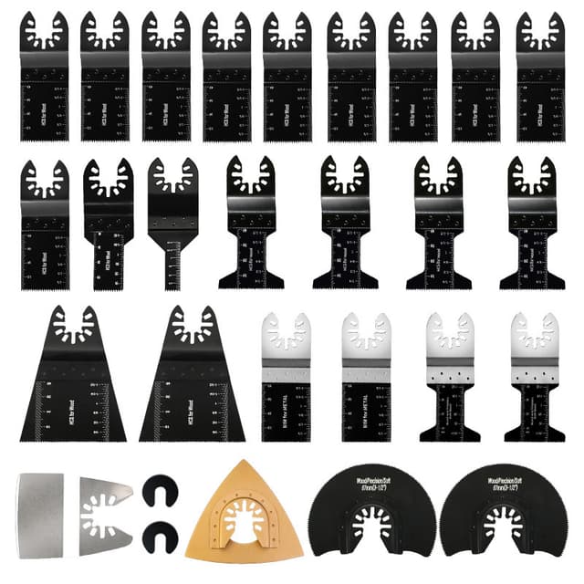 Bladsettet brukes til kapping og sliping av tre, metall, etc., egnet for ulike merker av Oscillerende multiverktøy. Inneholder ulike typer sagblad, den er slitesterk og kan spare tid.