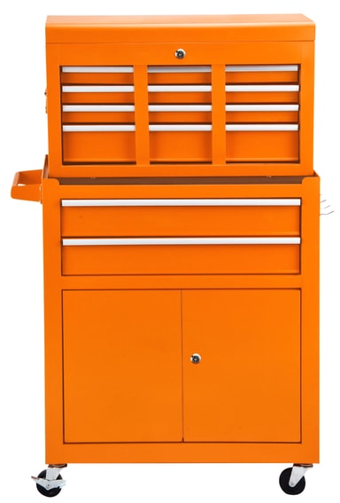 Verktøyvogn med avtakbart toppkabinett med bærehåndtak Med til sammen 14 skuffer med kulelager, aluminiumshåndtak og låsbare skapdører Utstyrt med 4 stk. Ø1""×3"" svinghjul, 2 av dem med brems Oransje pulverlakkert overflate med Work>it-logo