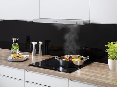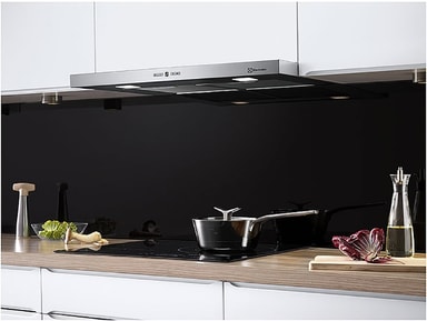 Dette er en kombinert ventilator fra Electrolux som integreres i overskap. Det tynne designet gjør at den gjør lite ut av seg og LED-pærer gir godt med arbeidslys på platetoppen.Les mer om produktet