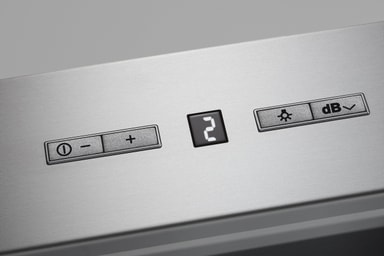 Styrke: Ventilatoren har en filtreringskapasitet på 384 m3/t. Bruk den elektroniske betjeningskontrollen på panelet til å velge mellom 3 og intensivmodus.