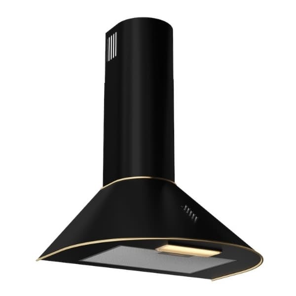 Vegghengt ventilator med energiklasse A+ i svart med buet front for et spennende design i kjøkkenet. Kapasitet på 296-426 m3/t og lydnivå 61-69 db.