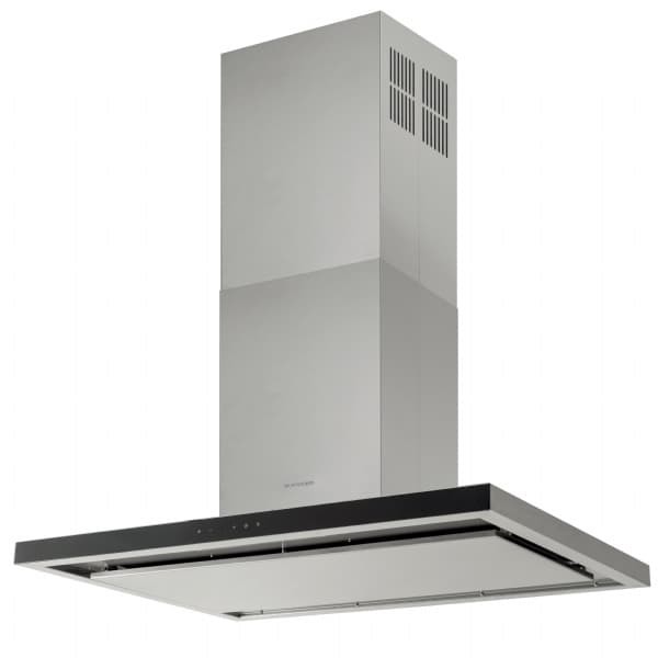 Fritthengende ventilator, stål med svart glasskant, 90 cm, kapasitet 221-741 m3/t, lydnivå 41-63 dB, med fjernkontroll, energiklasse A