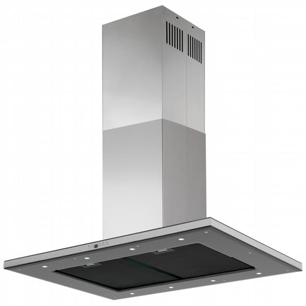 Fritthengende ventilator med svart glass i topp og bunn, dekorasjonslys i topp, 90 cm, stål, kapasitet 248-628 m3/t, lydnivå 44-64 dB, energiklasse C