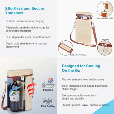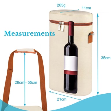 Med mål på 21 x 36 x 10 cm gir vesken plass til to standard vinflasker.