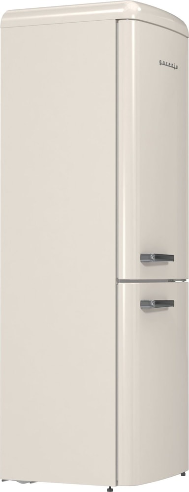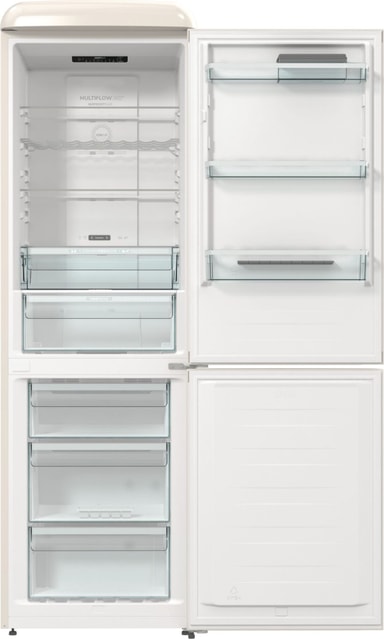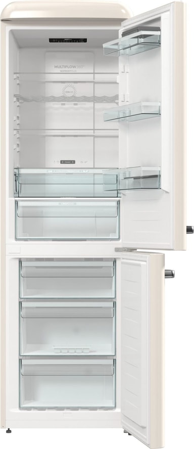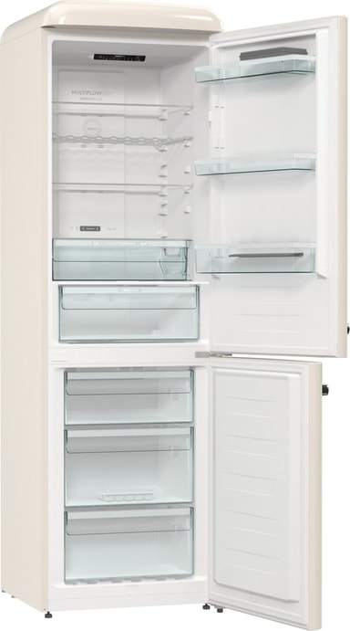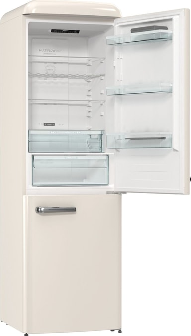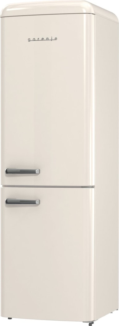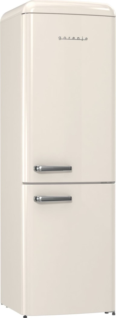 Gorenje Retro-kolleksjon, kombiskap, 194 x 60 cm, beige. Energiklasse D. NoFrost Plus for å forhindre isdannelse i fryserrommet. LED-display. 300 liter (204/96). 38 dB. IonAir med MultiFlow360 for å unngå vond lukt i kjøleskapet. AdaptTech som forstår deg og tilpasser seg etter dine vaner. CrispZone med Humidity Control for frisk frukt og grønnsaker. Høyreåpning
