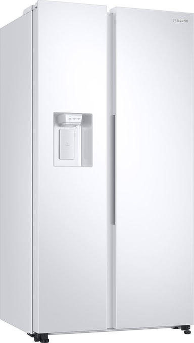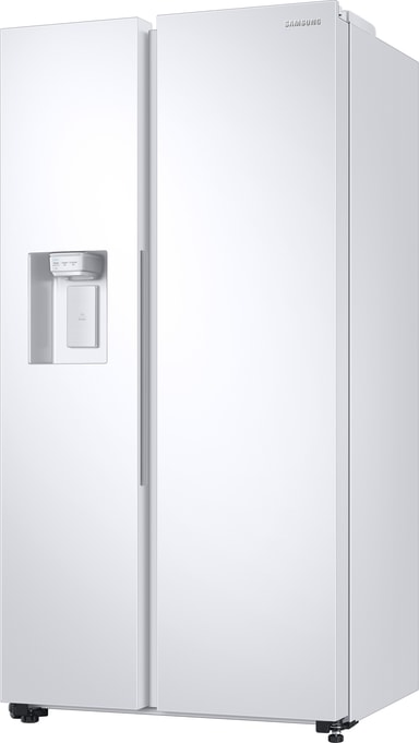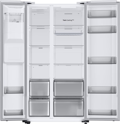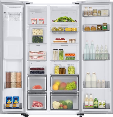 Dette moderne side-by-side kombiskapet fra Samsung har alt du trenger for å holde matvarene ferske over tid. Det har MultiFlow-kjøling, NoFrost-teknologi og stor kapasitet slik at du enkelt får plass til matvarer til hele familien.I tillegg har det en vanndispenser og isbitmaskin slik at du kan unne deg noe iskaldt å drikke når det måtte være.