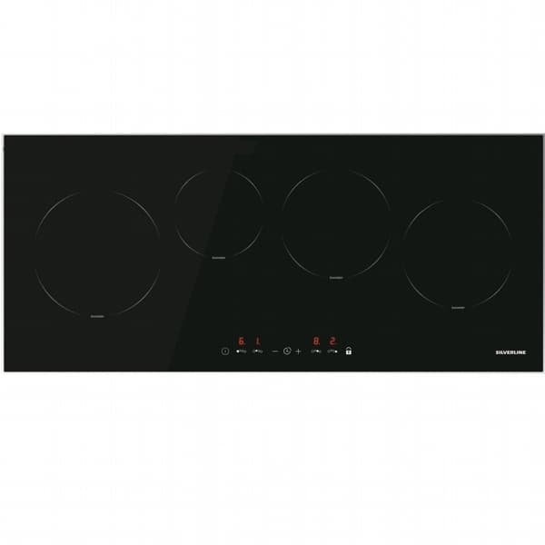 Silverline induksjonsplatetopp i 90 cm bredde og kun 40 dyp. Fingertouchbetjening, timerfunksjon i alle soner, automatisk gryteregistrering, boostfunksjon i alle kokesoner, barnelås, overopphetingsbeskyttelse. 1. sone: Ø210mm. 2. sone: Ø145mm. 3. & 4. soner: Ø180mm. Størrelse 90 x 40 cm.