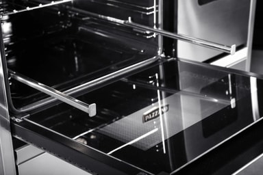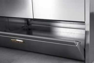 Ovnsdørene har trippelglass for økt sikkerhet og bedre isolering. Innerglasset kan tas ut, noe som gjør rengjøringen enkel. Hver ovn leveres med langpanne og grillrist i rustfritt stål. I fronten finner du en bred og diskret forvaringslucke – ideell for plater og tilbehør, elegant integrert i designet.