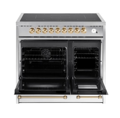 Pazzano - Cuore - Induksjonskomfyr 90 cm (2 ovner) (Rustfri/Børstet messing) Cuore-serien fra Pazzano er utviklet for deg som ønsker en komfyr med karakter – der italiensk design møter høy ytelse og smarte funksjoner. Dette er en 90 cm bred induksjonskomfyr med 2 ovner og flexinduksjon som gir rikelig med plass og passer perfekt for deg som lager mat med hjertet, enten det er til hverdags eller når du samler venner og familie rundt bordet.