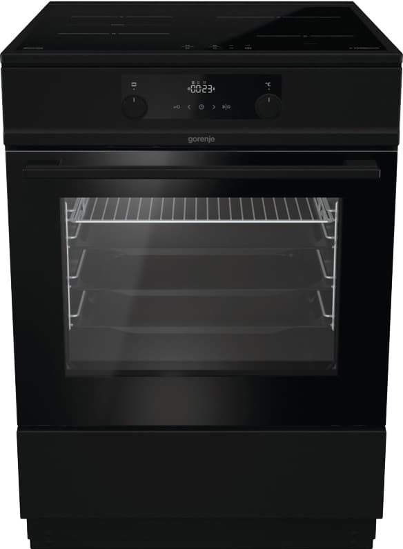 Gorenje Jet Black induksjonskomfyr med et 71-liters ovnsrom med vedovn-design, praktiske funksjoner og Aqua Clean-teknologi hjelper deg å tilberede en deilig lunsj eller middag for hele familien, når som helst.