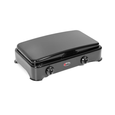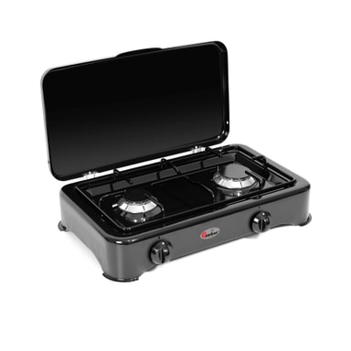 Parker er et frittstående sort kokeapparat med 2 bluss for plassering på benk.