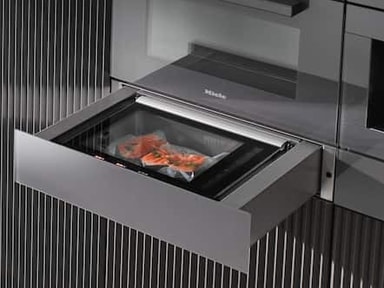 For skånsom sous-vide-tilberedning med Mieles dampovn kan du forberede maten perfekt med Mieles vakuumeringsskuff. For å gjøre dette blir luft og oksygen trukket ut av vakuumposen. Deretter er maten klar for en svært skånsom sous-vide-tilberedning, der maten beholder de aller fleste vitaminer og næringsstoffer. Samtidig blir f.eks. kjøtt ekstra saftig og får en kraftig aroma.
