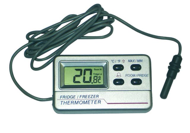 Digital termometer for kjøle- og fryseprodukter. Måler i tillegg romtemperatur. Termometeret har minnefunksjon for høyeste og laveste temperatur. Måleområde for kjøleskap og fryser fra -50°C til +70°C.