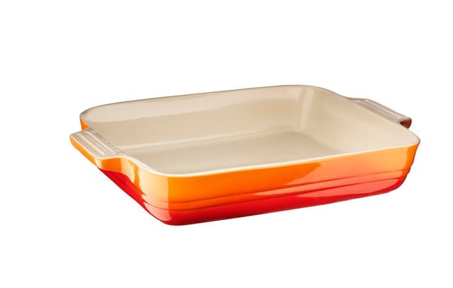 Le creusets rektangulæ:re fat i stentø:y har et klassisk og funksjonelt design. Fatet kan brukes på: mange må:ter og er et opplagt valg til tilberedning av for eksempel lasagne eller kylling i ovn. Stentø:yfatet tå:ler bå:de ovn, mikrobø:lgeovn og fryser. Det slitesterke stentø:yet har en innvendig sandfarget glasur som er rengjø:ringsvennlig, og gjø:r fatet ugjennomtrengelig for smak, fukt, lukt og farge fra matvarer. Stentø:yfatet kan brukes ved temperaturer fra -18°: til +260 °:c og tå:ler rengjø:ring i oppvaskmaskin.
