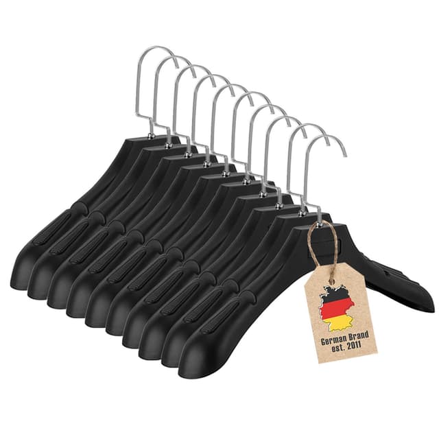 DESIGN: Ergonomisk utformet. Ekstra brede kleshengere laget av høykvalitets plast og forkrommede metallkroker i klassisk og tidløs sort. slik at de enkelt kan tilpasse seg enhver garderobe og garderobe.