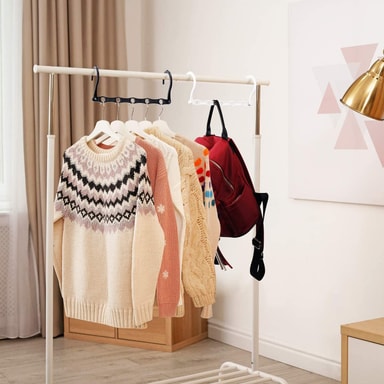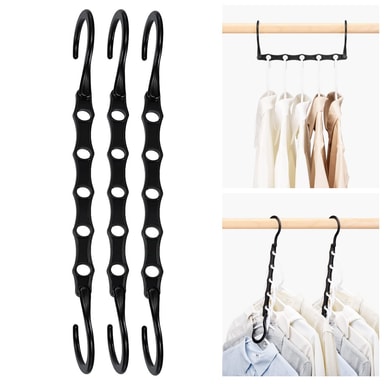 Hjelper deg med å organisere skapet og spare plass. Hver kleshenger har 5 hull for å hindre at klærne sklir. Bæreevnen er ca 10 kg, og den kan brukes ved å stable trekanthengere.