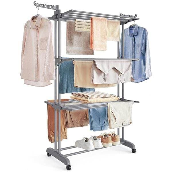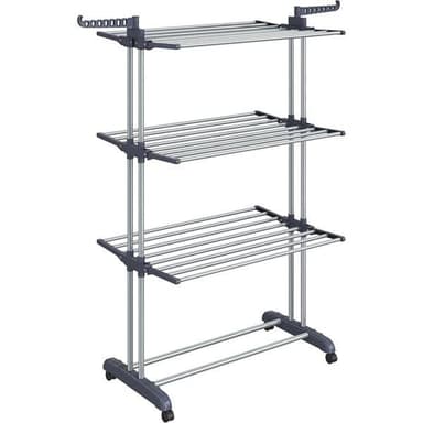 Stort tørkestativ i 4 nivåer med roterende kroker og hjul - Grå