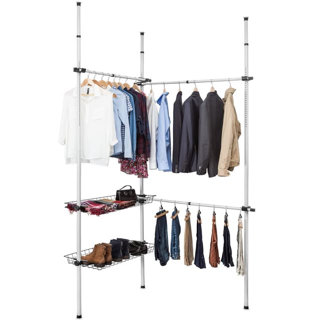 Man trenger ikke alltid et nytt skap. Teleskop-garderoben fra tectake er det smarta alternativet. Telskopstengene tilpasser seg til nesten alle romhøyder og valgfri bredde. Få orden på frakker, kjoler, overdeler og bukser. Praktisk: Begge nettkurven gir dessuten oppbevaringsmulighet for ulike tilbehør. Teleskop-garderobesystemet bygges opp på noen få minutter. Glem besværlig boring, plugger og skruer. Garderoben spennes opp mellom gulv og tak med teleskop-fjærmekanismen.