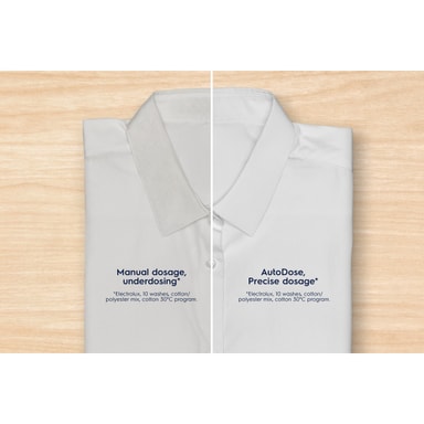 AutoDose-smartsensorer beregner den nøyaktige mengden vaskemiddel og tøymykner basert på tøymengden, noe som beskytter det mot tidlig slitasje på grunn av overdosering. Få vaskemiddelet til å vare lenger med AutoDose intelligent dosering.