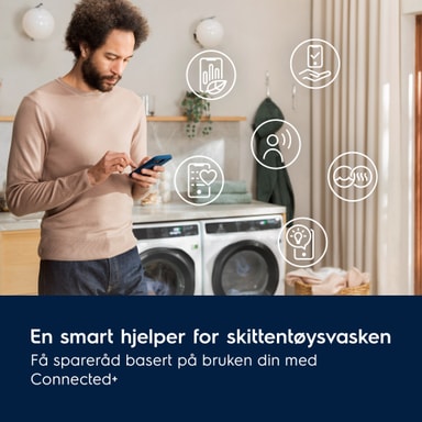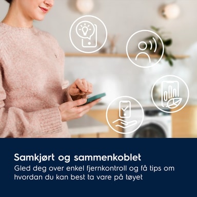 Nyt enkel navigering og persontilpasning med DynamicDisplay. Få tips på skjermen og rask tilgang til favorittsyklusene dine med tilpassede innstillinger; og koble produktet ditt til Electrolux-appen for å kontrollere klesvasken din eksternt mens du mottar råd om ressurssparing.