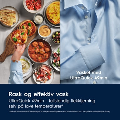 UltraQuick 49 min er et mer energieffektivt*, kraftig program optimalisert for daglig klesvask. Ved lave temperaturer (30 °C) og på kort tid (49 min), leverer det fullstendig flekkfjerning for blandet klesvask av bomull og syntetiske stoffer.** 1. *Basert på ekstern test av flekkfjerning på 50 vanlige husholdningsflekker ved hjelp av UltraQuick 30 °C-programmet med 5 kg klesvask **Basert på intern test som sammenligner energiforbruk for 40 °C bomullsprogrammet med 49 min 30 °C UltraQuick program 2. **Basert på intern test som sammenlignet energiforbruk i bomullsprogrammet ved 40 °C med det 49 minutter lange UltraQuick-programmet ved 30 °C. **Basert på ekstern test av flekkfjerning på 50 vanlige husholdningsflekker ved å bruke UltraQuick 30 °C*-programmet med 5 kg klesvask