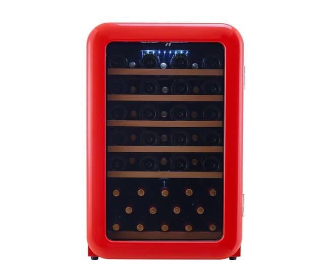 Denne nyheten er et retro-vinskap med én kjølesone (4-22°C) og rød dør med UV-fritt glass. Det er plass til 49 flasker (Bordeaux) i skapet.