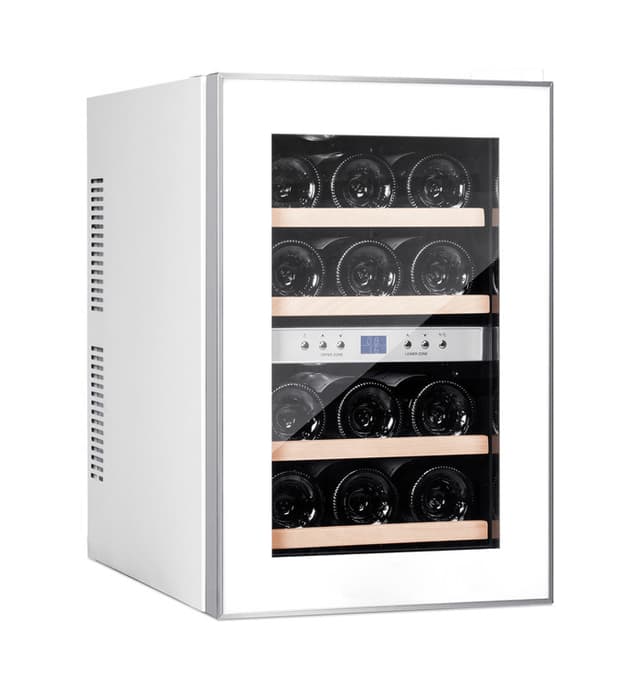 Et lite, stilrent og rimelig vinskap i helhvit utførelse! Vinskapet har plass til 12 flasker og har to justerbare temperatursoner så det er mulig å avkjøle både rødvin og hvitvin samtidig. Det har uttrekkbare hyller i tre, led-lys og termoelektrisk kjøling. Det perfekte vinskapet for kjøkkenbenken, sidebordet eller stående på gulvet.