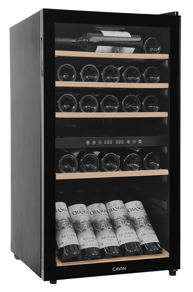 Frittstående vinskap fra cavin i helsvart design med energiklasse a. Vinskapet har plass til 24 flasker og leveres med to justerbare temperatursoner. En displayhylle nederst i vinskapet gir deg mulighet til å vise frem et utvalg av vinene du liker ekstra godt.