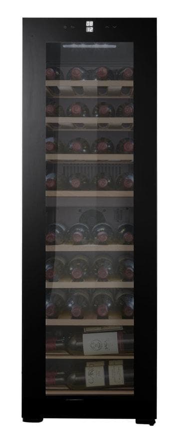 Cavin - Northern Collection 39 - Frittstående vinskap Unna dig vår stora fristående vinkyl från skandinaviska Cavin! Designen på Northern Collection 39 är stilren med svart yta, glasdörr, vitt LED-ljus och en digital display. Dörren har en helt slät då handtaget sitter inuti dörrens vänstra sida. På de syv uttrekkbare hyllene i tre kan du oppbevare hele 39 flasker vin. Passer for deg som har et litt større utvalg av vin som alltid er serveringsklar!