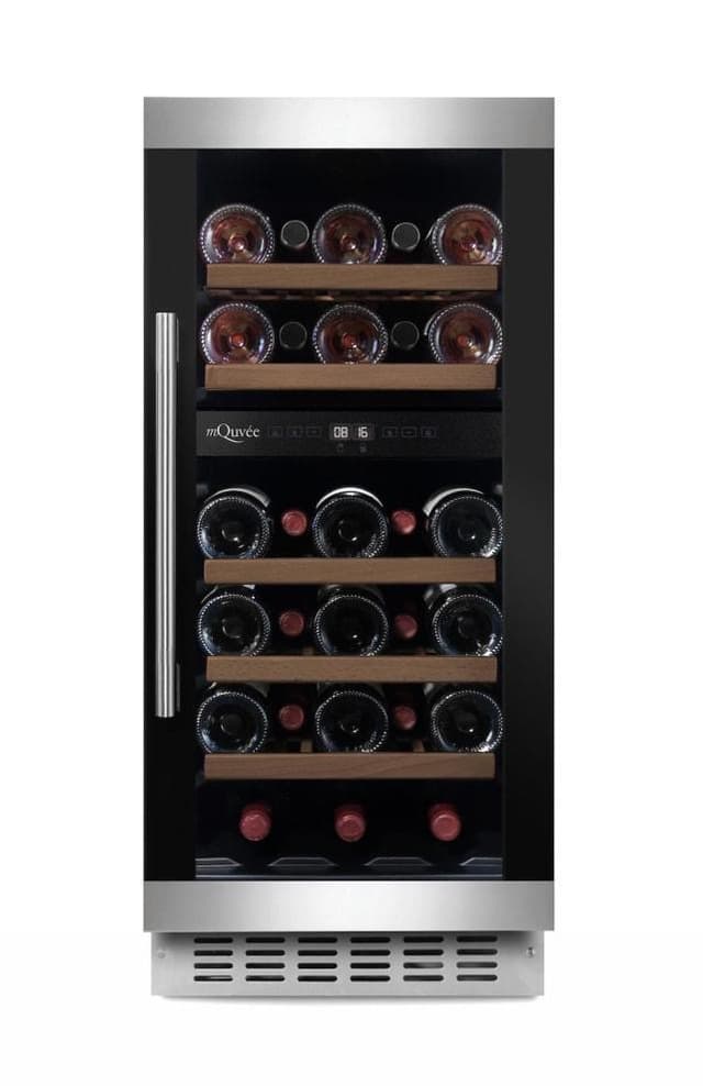 Et lekkert vinskap fra mQuvée som med en høyde på 82 cm og bredde på 40 cm passer inn på det skandinaviske markedet. Vinskapet kan enkelt bygges inn under kjøkkenbenken eller brukes frittstående. Med en kombinert dør i svart og rustfritt, to temperatursoner og med en seamless-door (dør uten skjøter), gir dette deg et vinskap med et stilrent uttrykk. Vinskapet har 5 uttrekkbare trehyller og plass til 28 flasker.