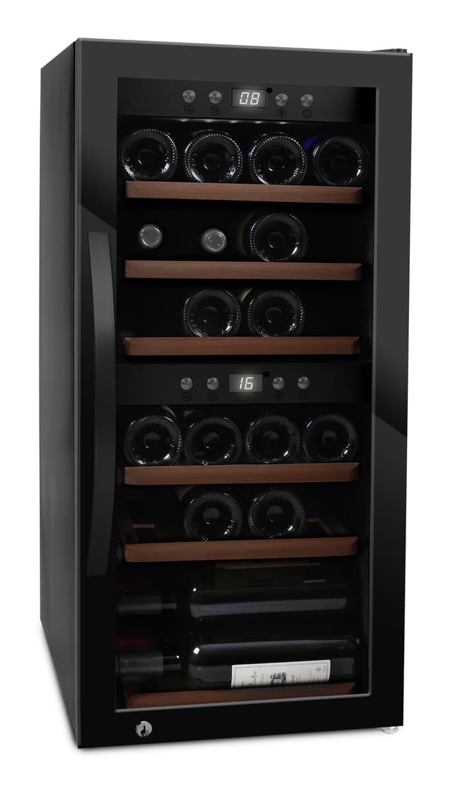 Stilrent og moderne vinskap fra mquvée. Vinskapet kommer i svart design, med ergonomiske håndtak og trehyller for det lille ekstra. Dette vinskapet har uv-beskyttet glassdør for å kunne bevare vinene på best mulig måte. Vinskapet har 2 justerbare temperatursoner, rommer 24 flasker og er energiklasse a.