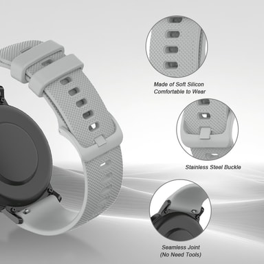 Sporty klokkerem i myk og slitesterk silikon. Stroppen er enkel å skifte og passer til ulike sportsklokker med 18 mm håndleddsbredde, som Garmin Venu 2S, Garmin Vivomove 3S, Garmin Move 3S, Garmin Vivoactive 4S, Garmin Active S, Garmin Forerunner 255S og Garmin Forerunner 255S Music.