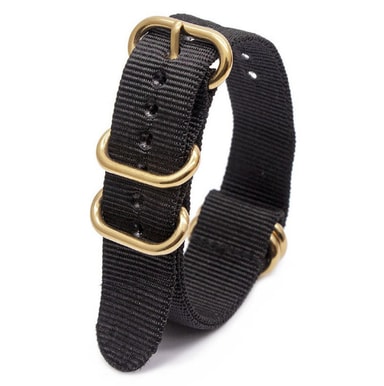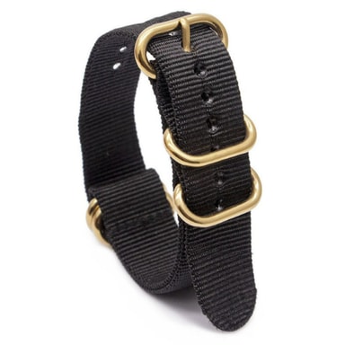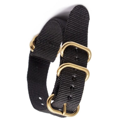 Denne komfortable og pustende stroppen er laget av førsteklasses nylon og har en sikker oval gullspenne. Den er vannavstøtende, vaskbar og kompatibel med NATO, ZULU og andre klokker.Les mer om produktet