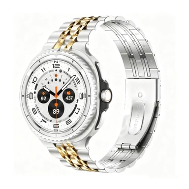 Premium Material Blend: Denne klokkereimen er laget av en blanding av titanlegering og rustfritt stål, og gir et sofistikert utseende og følelse. Kombinasjonen av materialer sikrer en behagelig passform samtidig som den gir motstand mot daglig slitasje. Titanlegeringskomponentene bidrar til reimens lette natur, mens elementene i rustfritt stål forbedrer dens strukturelle integritet og motstand mot korrosjon. Dette sikrer et langvarig og stilig tilbehør til din Samsung Galaxy Watch 8/8 Classic.