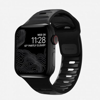 Nomad Sport Strap er støpt helt av slitesterkt LSR-silikon, et naturlig antimikrobielt og hypoallergent materiale, for å skape et mykt og komfortabelt armbånd.