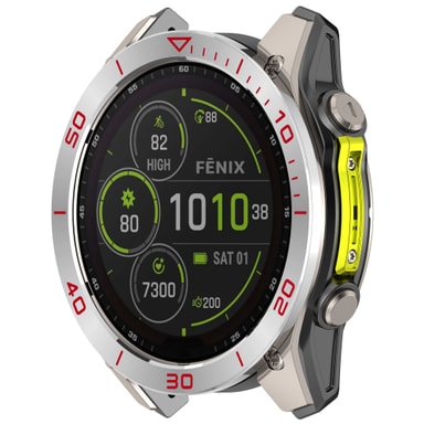 Forbedret stil: Løft din Garmin Tactix 8 51mm Solar smartklokke med denne elegante, sølvfargede og røde rammen i rustfritt stål. Den gir et snev av raffinement og personlig tilpasning til enheten din, noe som gjør den egnet for både utendørseventyr og hverdagsbruk. Den raffinerte designen integreres sømløst med klokkens estetikk, forbedrer det generelle utseendet og gir et uttrykk for stil og kvalitet.