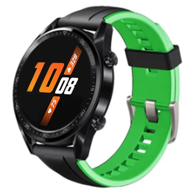 Tufft tvåfärgat Sport armbånd med snabbfäste för enkel montering. Specifikationer Färg: Svart/grön Passar: Huawei Watch GT2  Modellnr: GT2 46mm Längd: 90 + 120mm Bredd: 22mm Material: Silikon Fäste: Snabb bandsprint Spänne: Metall              Innehåll 1 x Sport armbånd silikon