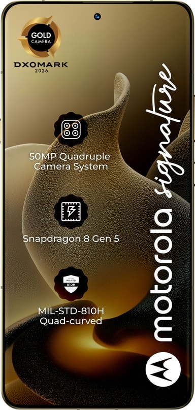 Motorola Signature smarttelefon med varig ultra-tynt design gir det ultimate innen ytelse, og utmerkede bilder takket være Sony LYTIA™-sensorer, Snapdragon 8 Gen 5-prosessor, 5200mAh batteri, og støtte for trådløs lading.Les mer om produktet