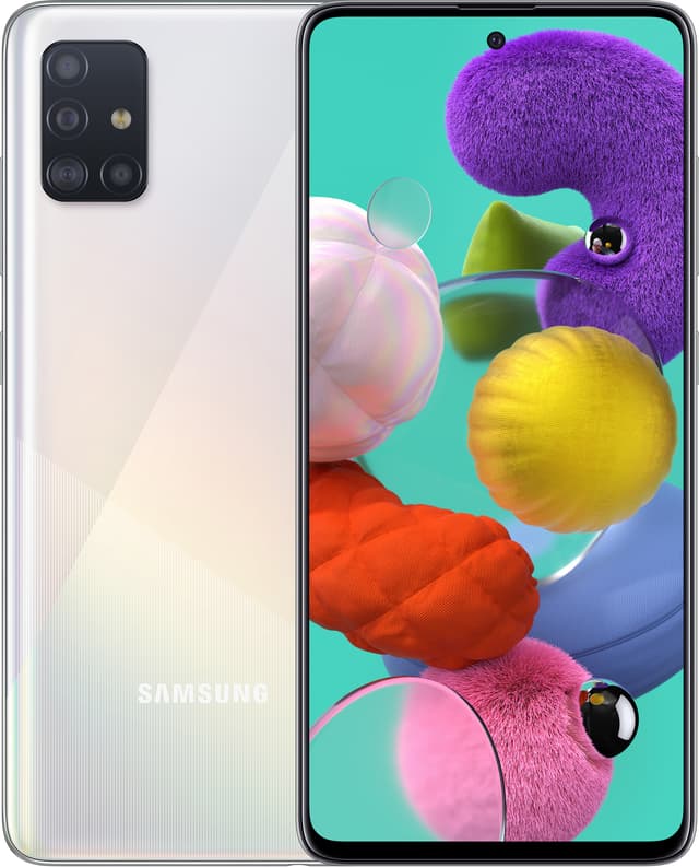 Samsung Galaxy A51 har et stilig design og en mønstret bakside med glossy finish og en 6,5 tommer stor Infinity-O touchskjerm som dekker bortimot hele telefonens fremside. På baksiden har telefonen et kraftig oppsett med fire kameraer som tar gode bilder nesten uansett belysning.